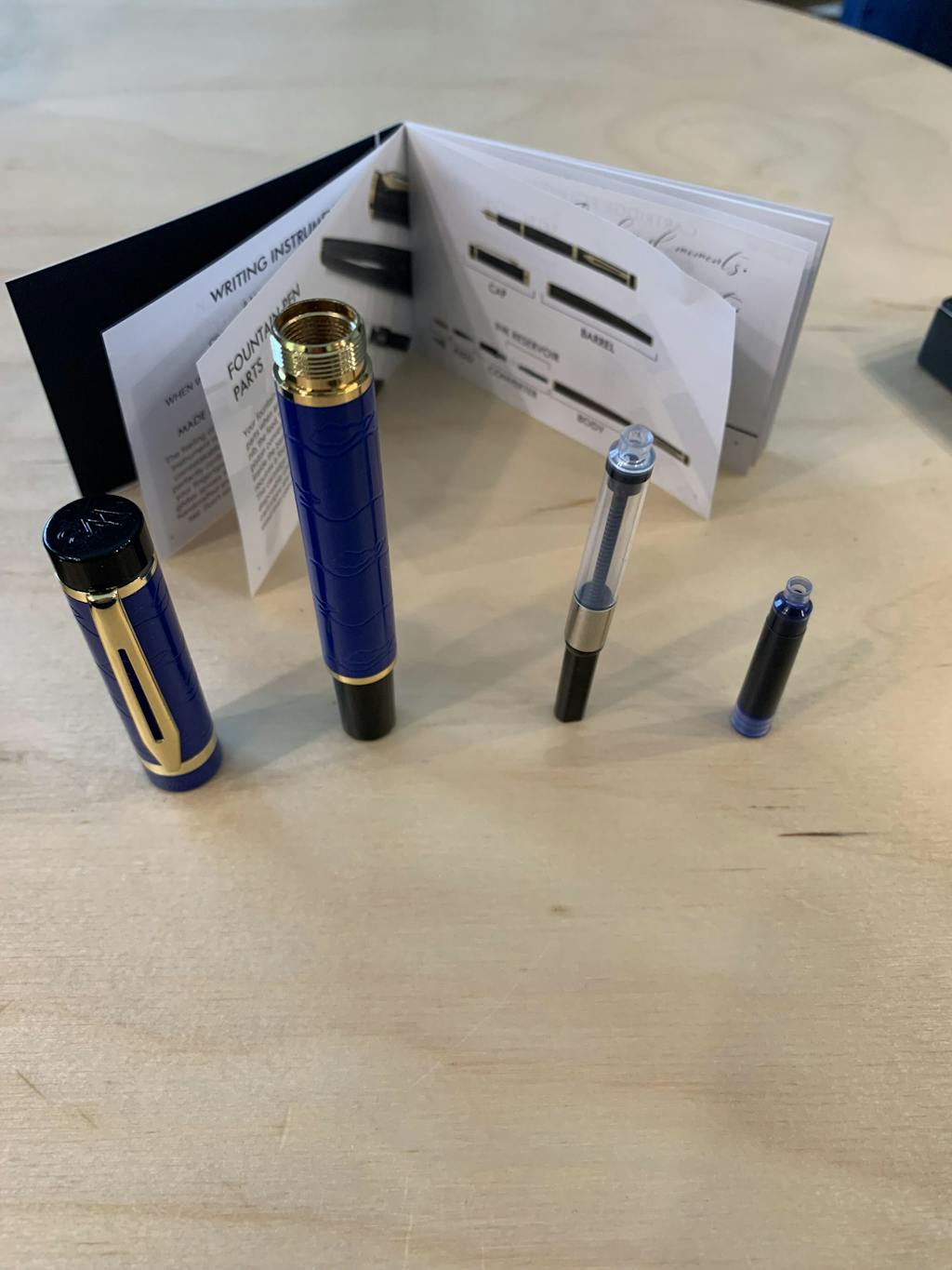 Our luxurious gift  box comes with a fountain pen of your choice, 24 pack of  ink carridges (12x black, 12x blue) and also comes with an ink converter.